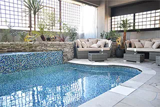 南国を思わせる観葉植物に、プールのある中庭でリゾート気分を味わえます。