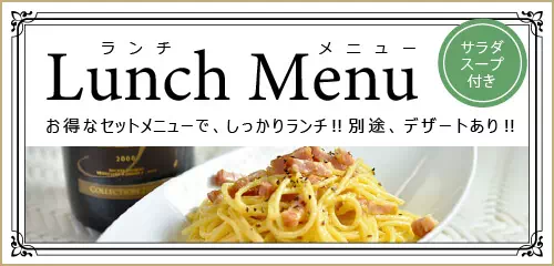 メインのお料理にサラダ・スープが付く、セットメニューが中心です。別途、デザート、ドリンク、アルコールなどのサイドメニューもご用意しております。