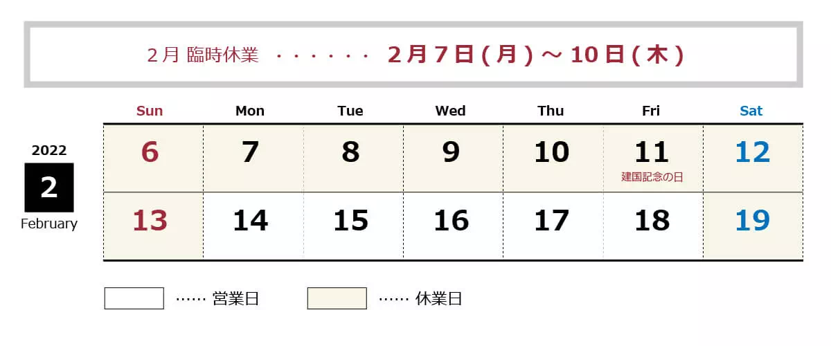 - 休業日の ① ② につきましては、X(旧Twitter)など、SNSにてお知らせしております。